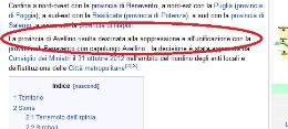 Evidentemente, gli autori e i blogger che collaborano all’aggiornamento di Wikipedia non hanno ancora ben assimilato il contenuto del decreto legge. Stamane, infatti, l’enciclopedia online più seguita nell’universo, alla pagina dedicata alla provincia di Avellino, portava la dicitura: “La provincia di Avellino risulta destinata alla soppressione e all’unificazione con la provincia di Benevento; la decisione è stata approvata dal Consiglio dei Ministri il 31 ottobre 2012 nell’ambito del riordino degli enti locali e dell’istituzione delle Città metropolitane”.