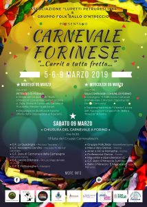 Il programma del Carnevale proseguirà mercoledì 6 Marzo alle ore 17:30 con un convegno di studio dal tema “Il Patrimonio Culturale Immateriale, criticità e opportunità per le Comunità”” che si terrà presso la sala Consiliare del Comune di Forino. Interverranno: Katia Ballacchino, Docente di Antropologia Culturale dell’Università di Salerno; Antonio Olivieri, Sindaco di Forino; Carmine Iannaccone, Dirigente scolastico I.C. di Forino; Enza Trerotola, collaboratrice D.S. rapporti con il territorio dell’I.C. di Forino; Domenico Fruncillo, Docente di Scienze Politiche dell’Università di Salerno in qualità di moderatore. Presentazione a cura dei rappresentanti delle associazioni organizzatrici: Domenico De Rita, Presidente dei Lupetti Petruresi 1964 e Gerardo Fiorino rappresentante dell’A.C. Gruppo Folklorico Ballo ‘O ‘Ntreccio (responsabile organizzativo del Carnevale Forinese).