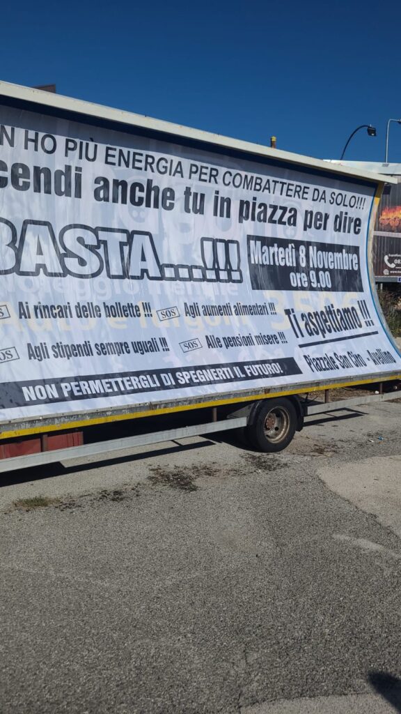 Un nuovo corteo, cui si spera partecipi l’intera città, partirà – l’8 novembre – alle 9 da piazzale San Ciro. Gli slogan scelti sono efficaci: “Scendi anche tu in piazza per dire basta ai rincari delle bollette, agli aumenti alimentari, agli stipendi sempre uguali, alle pensiori misere”.