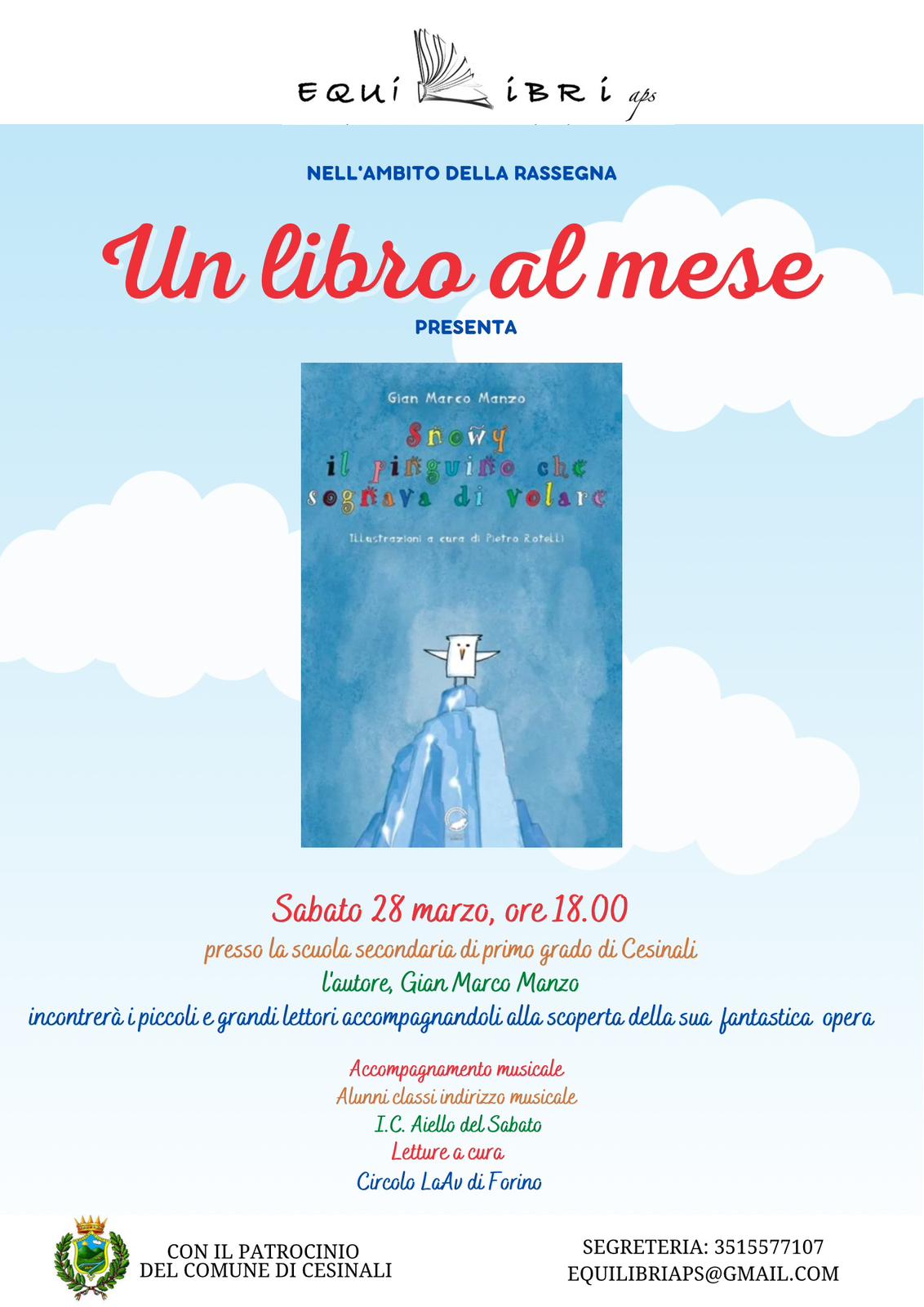 Il prossimo appuntamento si terrà a Cesinali, presso il salone della Scuola Secondaria di Primo Grado di Cesinali, e sarà dedicato alla presentazione del libro “Snowy – Il pinguino che sognava di volare“, scritto da Gian Marco Manzo.