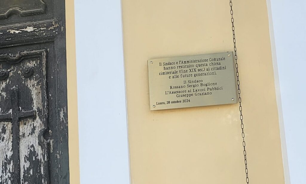 LAURO- A Lauro scoppia la polemica di Ognissanti per i lavori della Chiesa del Cimitero. Una battaglia a colpi di botta e risposta social tra l’amministrazione comunale guidata da Rossano Sergio Boglione e il gruppo di opposizione di “Lauro in Volo”. Il motivo del contendere? A quanto pare è la targa che dal 28 ottobre campeggia sulla Chiesa recuperata nel Cimitero ed in particolare la Cripta dove ci sono defunti a cui da anni i propri cari non potevano portare un fiore o un lumino. Completati i lavori, l’amministrazione comunale ha deciso di apporre una targa. Ecco cosa c’è scritto: Il Sindaco e l’Amministrazione Comunale hanno restituito questa chiesa cimiteriale (fine XIX scc.) ai cittadini e alle future generazioni. Il Sindaco Rossano Sergio Boglione ; L’Assessore ai Lavori Pubblici