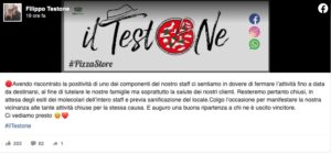 Anche la pizzeria “Il Testone” ha fatto sapere ai clienti, attraverso i social network, che: “Avendo riscontrato la positività di uno dei componenti del nostro staff ci sentiamo in dovere di fermare l’attività fino a data da destinarsi, al fine di tutelare le nostre famiglie ma soprattutto la salute dei nostri clienti. Resteremo pertanto chiusi, in attesa degli esiti dei molecolari dell’intero staff e previa sanificazione del locale.Colgo l’occasione per manifestare la nostra vicinanza alle tante attività chiuse per la stessa causa. E auguro una buona ripartenza a chi ne è uscito vincitore”.