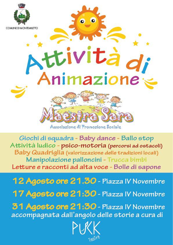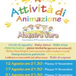 I primi appuntamenti con le attività di animazione a cura dell’associazione di promozione sociale “Maestra Sara” sono in programma il 12, 17 e 31 agosto alle ore 21:30 in Piazza IV Novembre. Previsti Giochi di squadra, Baby dance, Ballo stop, Attività ludico-psico-motoria (percorsi ad ostacoli), Baby Quadriglia (valorizzazione delle tradizioni locali), Manipolazione palloncini, Trucca bimbi, Letture e racconti ad alta voce e Bolle di sapone.