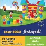 Il 14 agosto alle 17:00 in Piazza IV Novembre e il 19 agosto alle 20:00 in Viale Degli Astronauti appuntamento i con il tour 2022 di Festopoli. I più piccoli si potranno divertire con Gonfiabili, giochi, zucchero filato, teatro dei burattini e le mascotte Disney.