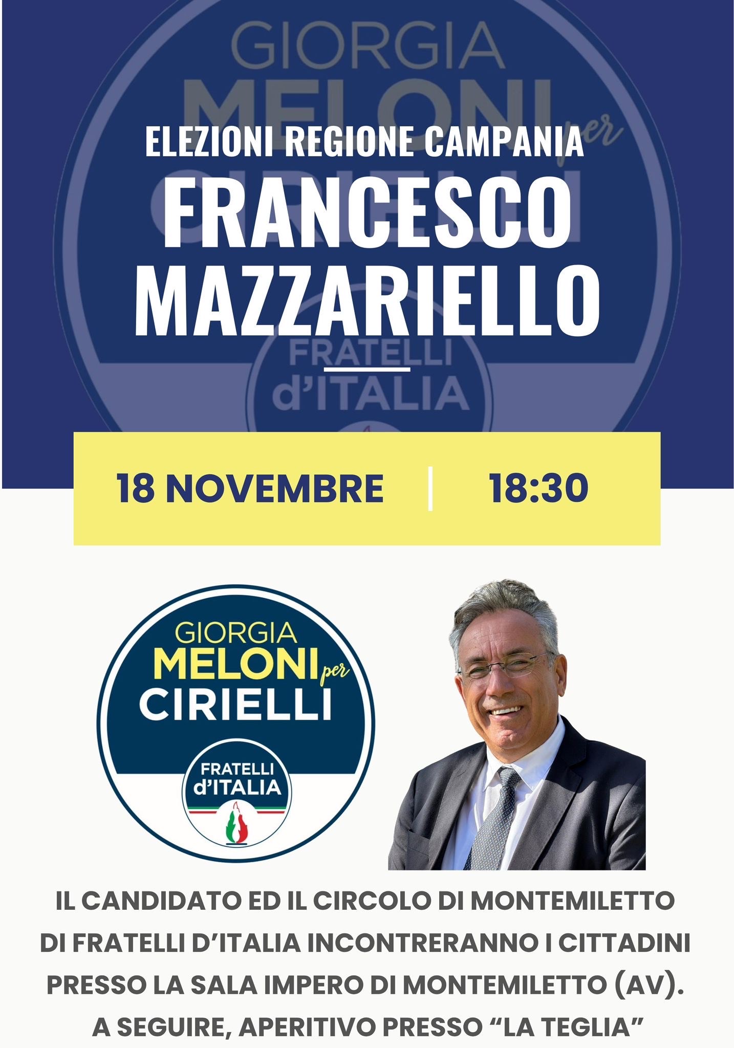 Martedì 18 Novembre alle ore 18:30 a Montemiletto presso la sala impero si terrà un incontro pubblico con il candidato alle regionali Francesco Mazzariello. Sarà un momento di confronto e di discussione sulle proposte politiche da attuare per la regione Campania. A seguire aperitivo presso il locale “La Teglia”.