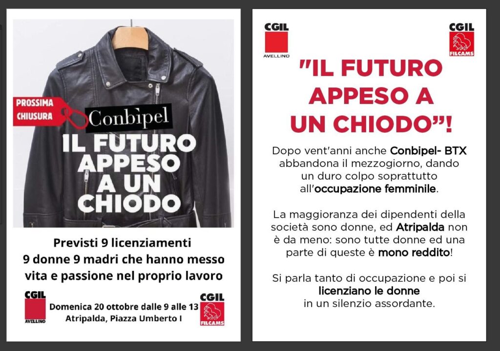 “Il futuro appeso a un chiodo”. Dopo vent’anni, anche Conbipel abbandona il Mezzogiorno, infliggendo un duro colpo all’occupazione femminile. La maggior parte delle dipendenti della società è, infatti, composta da donne. Lo stesso vale per Atripalda: tutte donne, molte delle quali sono monoreddito. Sarebbero previsti nove licenziamenti, che coinvolgeranno nove donne, nove madri che hanno dedicato vita e passione al proprio lavoro. Ieri si è tenuto un sit-in di protesta in piazza ad Atripalda, dove erano presenti il sindaco Paolo Spagnuolo, la consigliera regionale di parità Mimma Lomazzo e la neo segretaria della Cgil, Italia D’Acierno.