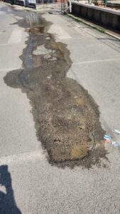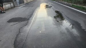 Anche in questo caso almeno nella parte alta non sarebbe il primo evento, con annesso intervento di manutenzione. Del resto i segni sulla strada sono evidenti. Quanta acqua perderanno ogni giorno queste condotte “groviera”? E cosa penseranno i cittadini di Lauro, che come tanti altri irpini hanno dovuto sopportare varie sospensioni idriche di fronte a queste scene? Si perdono vari litri di acqua ma nelle case si sospende l’erogazione. Potreste pensare, stavolta non giustamente però: pensano ai tubi rotti e all’acqua, evidentemente poca rispetto al resto della provincia, che si perde in un paesino? Ma questa è una delle segnalazioni che ci giungono. Perche’ tante perdite concretizzano invece un danno. Come si pensa di risolverlo? Si è capito che, nonostante la buona volontà delle ditte e dello stesso Alto Calore negli interventi, queste rischiano di trasformarsi nelle più classiche “toppe peggiori del buco”
