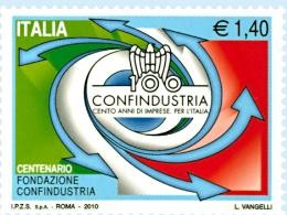 Poste Italiane emette, per il giorno 5 maggio 2010, di un francobollo celebrativo di Confindustria, nel centenario della fondazione, nel valore di 1,40 euro. La vignetta riproduce, su fondo celeste, il tricolore, al cui centro campeggia il logo del centenario di Confindustria dal quale si dirama un ideale vortice di frecce. Completano il francobollo la leggenda “Centenario Fondazione Confindustria”, la scritta “Italia” e il valore “€ 1,40”. Lo “Spazio Filatelia” utilizzerà, il giorno di emissione, l’annullo speciale realizzato a cura della Filatelia di Poste Italiane.