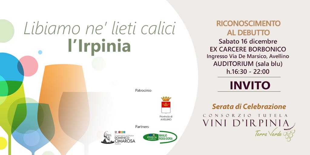 Sabato 16 dicembre, invece, il Conservatorio va in trasferta e sarà protagonista alle ore 20, presso la Sala blu dell’ex Carcere borbonico, per tenere a battesimo l’iniziativa «Libiamo ne’ lieti calici – l’Irpinia», organizzata dal Consorzio tutela Vini d’Irpinia per festeggiare il conseguimento del riconoscimento ministeriale per la tutela dei Docg e Doc del territorio della provincia di Avellino.