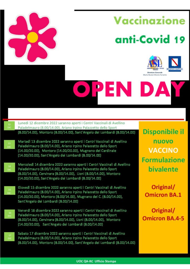 Lunedì 12 dicembre 2022 saranno aperti i Centri Vaccinali di Avellino Paladelmauro (8.00/14.00), Ariano Irpino Palazzetto dello Sport (8.00/14.00), Montoro (8.00/14.00), Sant’Angelo dei Lombardi (8.00/14.00)