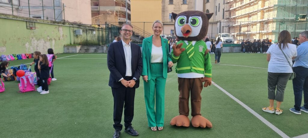 AVELLINO- Insieme. Questa è la parola d’ordine dell’anno scolastico che si è aperto questa mattina al Convitto di Avellino. Insieme come gli alunni di ogni età, dalla primaria al Liceo, che si sono stretti in un cerchio formato da 210 studenti, simbolo di questa vera e propria connessione reciproca e di un percorso formativo in cui saranno tutti i ragazzi di ogni età a condividere l’esperienza scolastica. Uno start scandito da immagini simbolo della giornata di accoglienza, denominata “Convittiamo Insieme”, quella che insieme al dirigente scolastico Attilio Lieto ha visto la presenza del sindaco di Avellino Laura Nargi. Due figure di riferimento per i ragazzi in questo percorso comune. La scuola ma anche la famiglia. Così alla manifestazione nel campetto dell’istituto dove gli studenti hanno inaugurato l’anno scolastico hanno potuto partecipare anche i genitori. Una mattinata scandita dalla poesia di Herman Hesse e dalla presenza di una mascotte particolare, che è stata scelta dagli stessi studenti del Liceo. La mascotte ideata graficamente dall’alunno Pasquale Guerriero è ispirata alla nottola di Minerva, simbolo di saggezza e conoscenza. La nottola di Minerva, spesso rappresentata come una civetta, è emblematica della capacità di vedere ciò che è nascosto e di comprendere profondamente il mondo, qualità attribuite alla dea romana Minerva. Inoltre, il colore verde utilizzato per la mascotte è rappresentativo della nostra città e degli spazi scolastici. Questo colore simboleggia la crescita, la vitalità e l’ambiente naturale che ci circonda, riflettendo il nostro impegno verso l’educazione e la sostenibilità. Unendo questi elementi, la mascotte non solo incarna saggezza e conoscenza, ma anche il legame con la comunità e del Convitto.