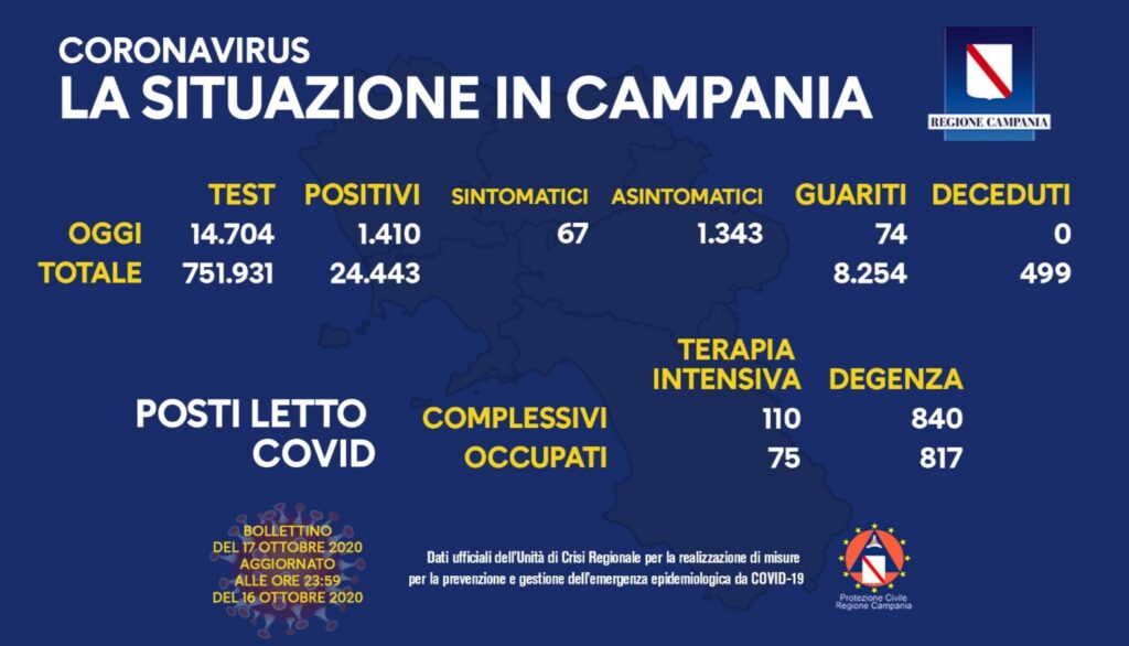 Oggi il numero di persone positive al Coronavirus in Campania, secondo i dati dell’Unità di crisi, raggiunge quota 1.410. Di questi, 67 sono sintomatici e 1.343 asintomatici. I tamponi effettuati nelle ultime 24 ore, invece, sono 14.704. In totale, dunque, il numero di positivi nella regione è 24.443, per un totale di 751.931 tamponi. Non si registra, però, nessun decesso nella giornata di oggi (il totale resta 499).