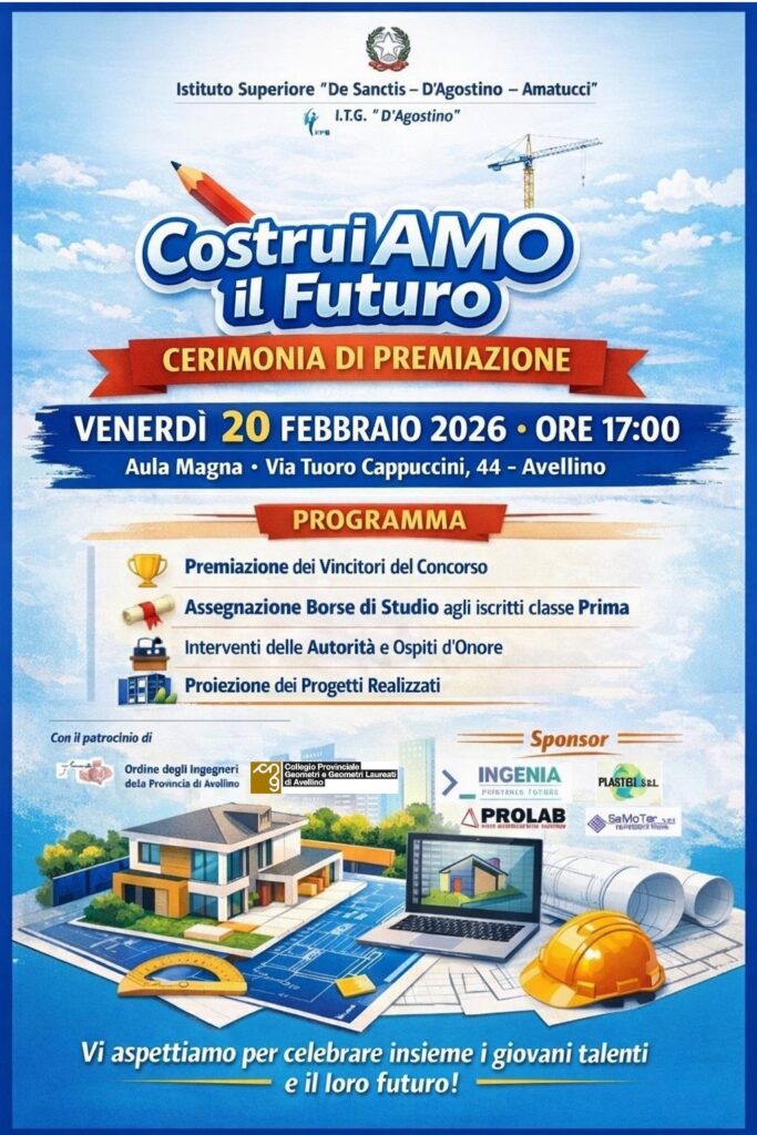 Si terrà venerdì 20 febbraio 2026, alle ore 17:00, presso l’Aula Magna dell’Istituto Superiore “De Sanctis – D’Agostino – Amatucci” – I.T.G. “D’Agostino”, in via Tuoro Cappuccini 44 ad Avellino, la cerimonia di premiazione “CostruiAMO il Futuro”.