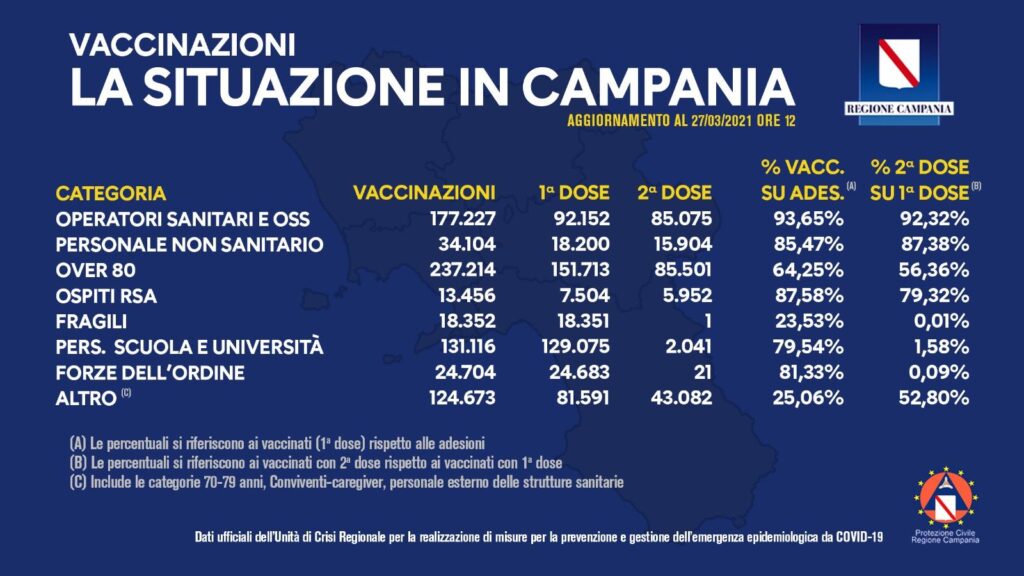 per la prevenzione e gestione dell’emergenza epidemiologica da COVID-19 comunica i dati delle vaccinazioni in Campania aggiornati alle ore 12 di oggi.