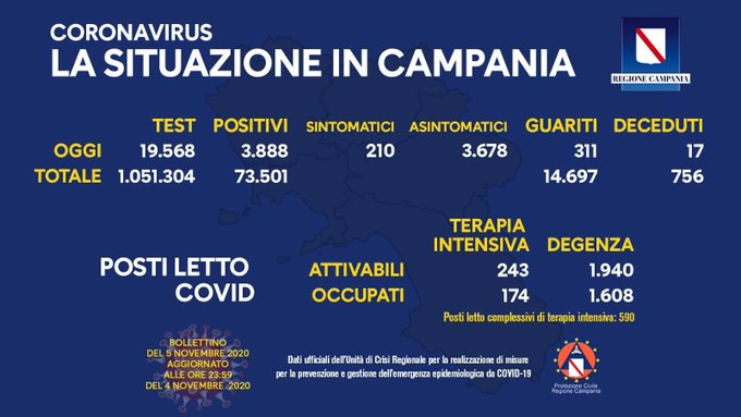 in Campania 3.888 casi, 17 decessi e 311 guariti = (AGI) – Napoli, 5 nov. – In Campania sono 3.888 i positivi nelle ultime 24 ore, di cui 3.678 asintomatici e 210 sintomatici su 19.568 tamponi.