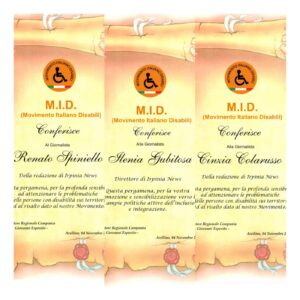 Il M.I.D., conferisce in via telematica alla Direzione della Redazione di Irpinia News e ai giornalisti Renato Spiniello e Cinzia Colarusso, chiedendone pubblicazione, una pergamena di merito del Movimento con la seguente motivazione espressa dal Coordinatore Regionale Giovanni Esposito: “Per la profonda loro ampia e sentita sensibilità nel porre attenzione alle problematiche delle Persone con Disabilità sui territori ed all’importante risalto alla voce del M.I.D.”