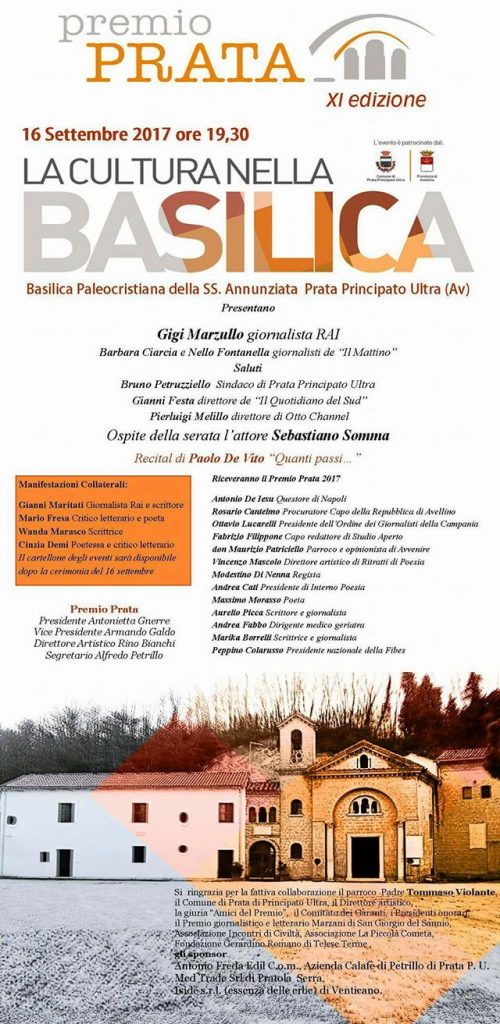 L’evento ha ricorrenza annuale e, col tempo, è riuscito a porsi all’attenzione dell’opinione pubblica nazionale e internazionale tanto da essere inserito nei circuiti di rete del sito dell’UNESCO. La cerimonia di premiazione della undicesima edizione si terrà Sabato 16 Settembre, alle ore 19.30. Cornice e cuore pulsante dell’evento è la Basilica Paleocristiana della SS. Annunziata, uno dei luoghi di culto più antichi del Meridione e sede di attività religiose anche in epoca pagana; il Premio Prata, infatti, nasce innanzitutto per valorizzare questa meravigliosa testimonianza del passato, capace di emozionare ancora oggi con la sua bellezza. A condurre la manifestazione, come di consuetudine, saranno Gigi Marzullo, giornalista RAI, Barbara Ciarcia e Nello Fontanella giornalisti de “Il Mattino”. I saluti saranno affidati al Sindaco di Prata di Principato Ultra Bruno Petruzziello, a Gianni Festa direttore de “Il Quotidiano del Sud”, a Pierluigi Melillo direttore di Otto Channel. Ospite della serata l’attore Sebastiano Somma. Recital di Paolo De Vito “Quanti passi…” con Gianluca Marino, Giuseppe Musto e Salvatore Santaniello. Il Premio è curato e gestito dall’Associazione Premio Prata con presidente Antonietta Gnerre, vice presidente Armando Galdo. Il Premio si articola in varie sezioni con lo scopo di esaltare il mondo culturale e quello della comunicazione, della ricerca scientifica e dell’impegno civile e sociale.