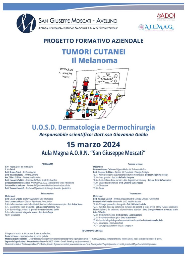Per fare il punto sulle nuove misure di diagnosi precoce e sui più attuali campi esplorativi della gestione terapeutica, il melanoma sarà l’argomento dell’incontro formativo che si terrà domani, 15 marzo, dalle ore 8,30, nell’aula magna dell’Azienda ospedaliera San Giuseppe Moscati di Avellino (Città ospedaliera, settore B, primo piano).