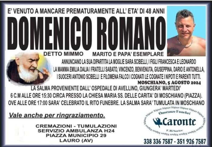 VALLO LAURO- Sara’ celebrato domani pomeriggio l ‘ultimo saluto a Domenico Romano, il quarantottenne papa’ di due bambini deceduto nel terribile frontale avvenuto il primo agosto sulla Ss403 tra Pago e Marzano. La salma di Romano, messa a disposizione della famiglia dopo l’esame autoptico eseguito nel pomeriggio, giungerà alle 15:30 nella chiesa di Maria Ss della Carità in Piazza a Moschiano, dove alle 17 sarà celebrato il rito funebre. La salma sarà tumulata nel cimitero di Moschiano. Un ultimo, mesto viaggio per il papa’ che è rimasto ucciso sul colpo dallo schianto avvenuto con una Fiat Cinquecento guidata da una venticinquenne di Moschiano. Come annunciato dal primo cittadino Sergio Pacia, in occasione dei funerali ci sarà il lutto cittadino.
