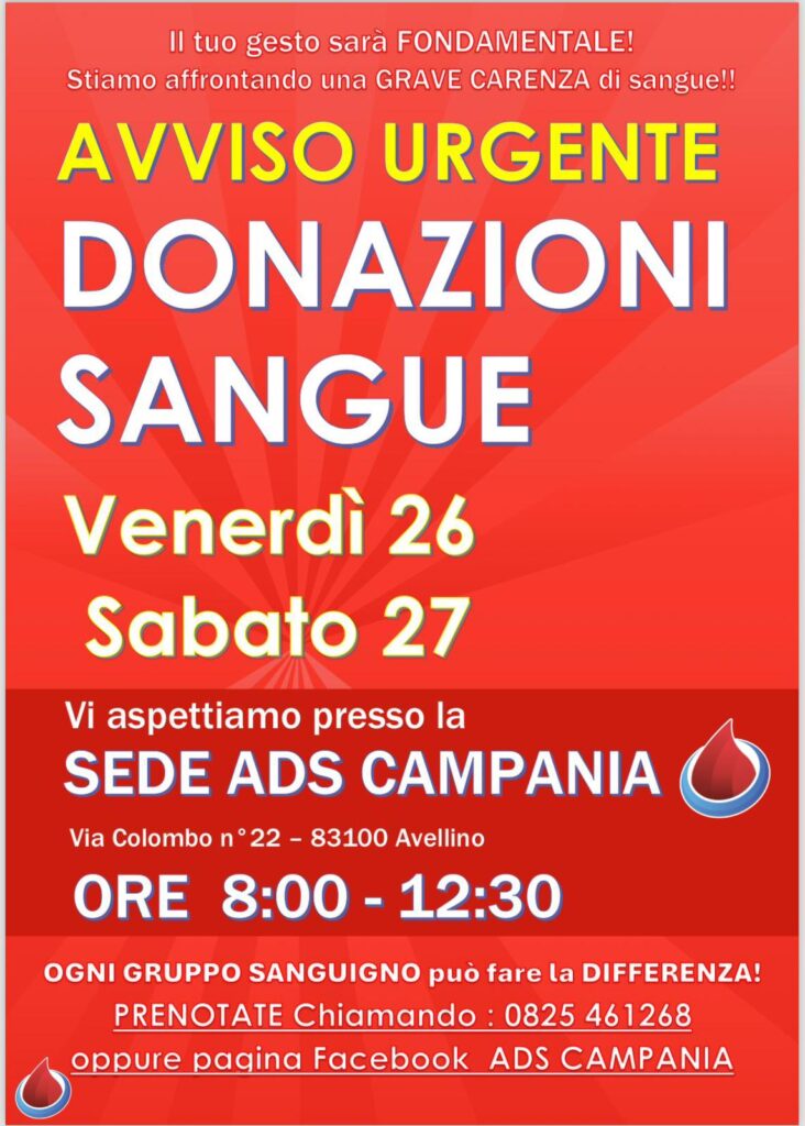 L’ ADS CAMPANIA fa appello alla sensibilità e alla generosità degli Avellinesi per garantire la necessità di sacche ematiche all’ Azienda ospedaliera San Giuseppe Moscati di Avellino, organizzando alcune raccolte sul territorio irpino, che di seguito si riporta: