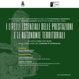 Nel pomeriggio, alle ore 16.00, in occasione del conferimento della cittadinanza onoraria al prof. Sabino Cassese da parte del Consiglio comunale della cittadina della valle del Sabato, presso la sede municipale, si terrà l’iniziativa pubblica, promossa dall’Amministrazione comunale e dal Centro di ricerca “Guido Dorso”, sul tema “I livelli essenziali delle prestazioni e le autonomie territoriali”.