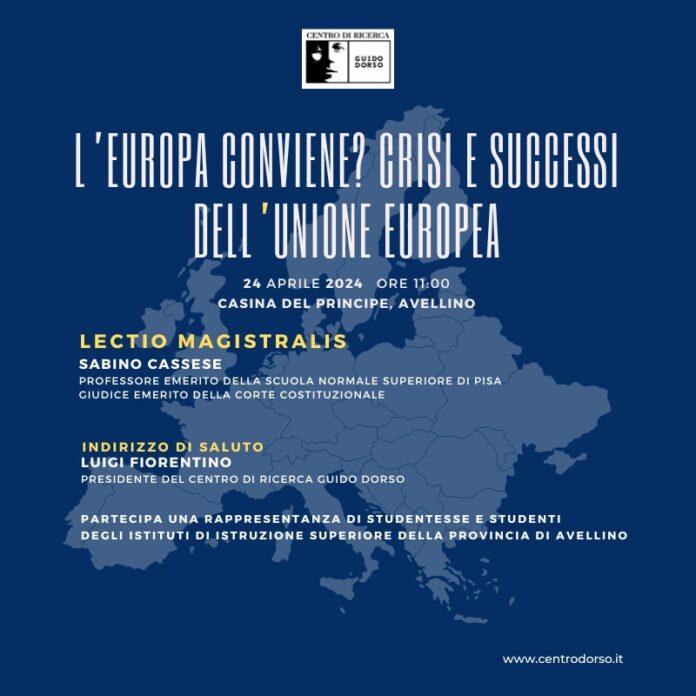 In mattinata, alle ore 11.00, presso la sede del Centro di ricerca “Guido Dorso” alla Casina del principe, dopo i saluti del presidente del Centro Dorso, Luigi Fiorentino, l’ex Giudice della Corte costituzionale terrà una lectio magistralis, rivolta ad una delegazione di studentesse e studenti degli Istituti di istruzione superiore della Provincia di Avellino, sul tema “L’Europa conviene? Crisi e successi dell’Unione europea”.