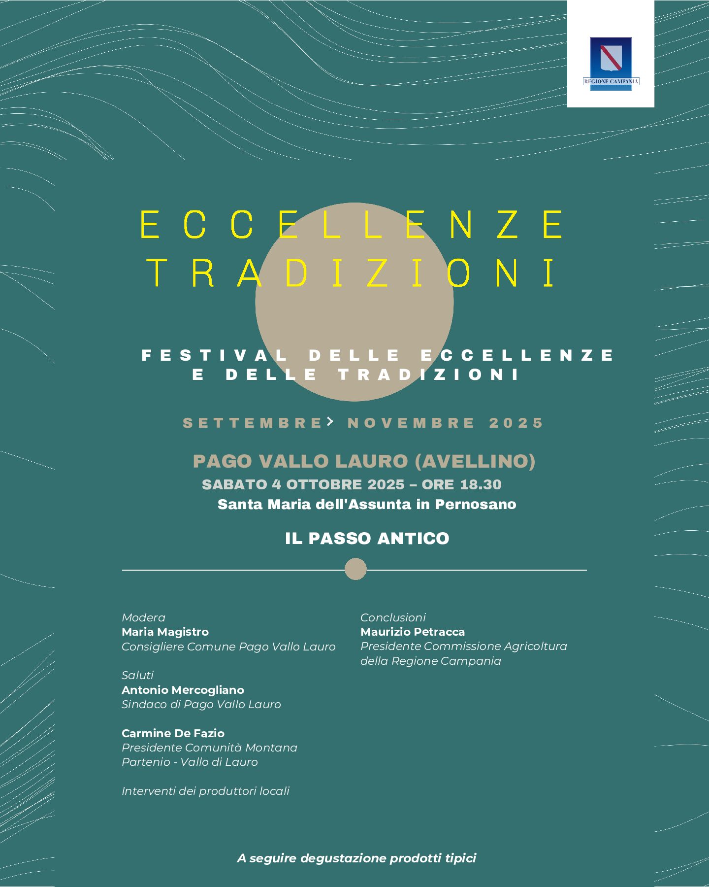 “Eccellenze e Tradizioni” fa tappa a Pago Vallo Lauro. Domani (sabato 4 ottobre) il Festival delle eccellenze e delle tradizioni, programma di eventi promosso dalla Regione Campania, proseguirà a Pago Vallo Lauro alle ore 18.30 presso Santa Maria dell’Assunta in Pernosano con l’iniziativa “Il passo antico”.