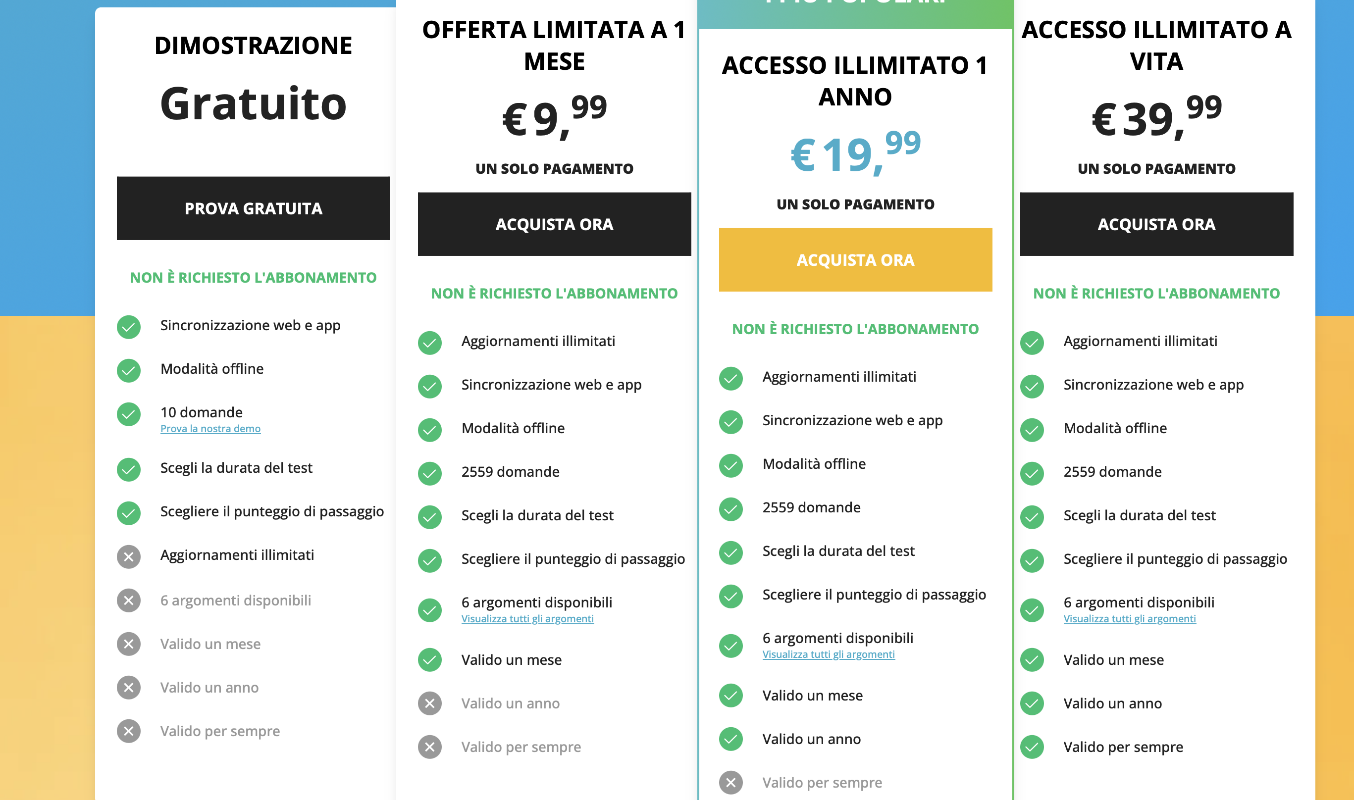 Studio Offline + Sincronizzazione Web/Mobile ✅ Disponibile: puoi studiare offline e ritrovare i progressi sincronizzati automaticamente su tutti i dispositivi ⚠️ Funzionalità di accesso ai quiz presenti, ma non è indicata chiaramente una sincronizzazione automatica o utilizzo offline ⚠️ Accesso e quiz fruibili via web, senza indicazioni specifiche su sincronizzazione tra dispositivi
