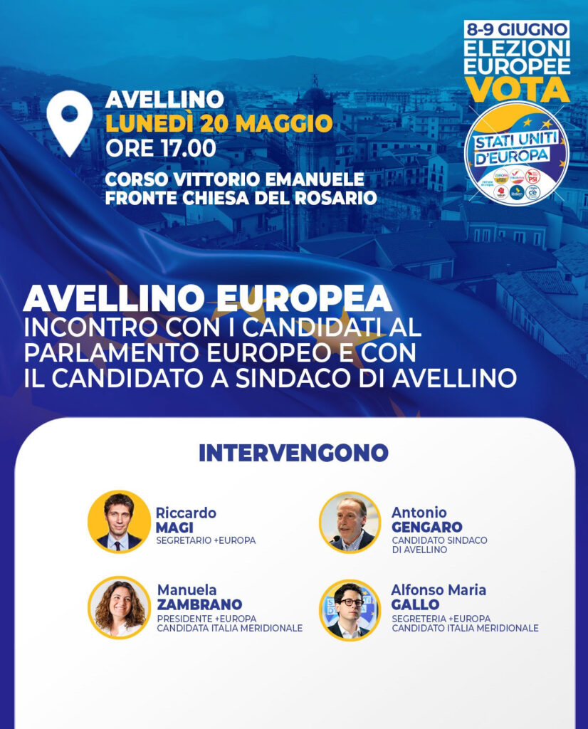 Appuntamento alle ore 17 ad Avellino, in corso Vittorio Emanuele all’altezza della Chiesa del Rosario, con la partecipazione del candidato sindaco Antonio Gengaro, sostenuto anche da +Europa nella lista APP Avellino Progetto Partecipato.