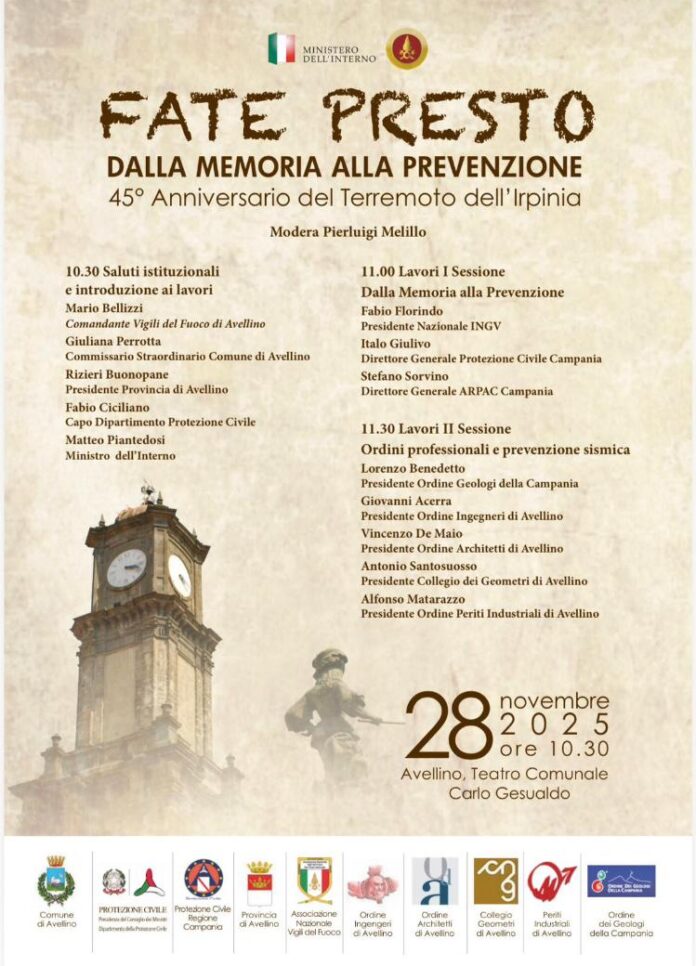 Nel 45° anniversario del terremoto che il 23 novembre 1980 sconvolse l’Irpinia e l’intero Paese, Avellino si prepara a ospitare un importante momento di riflessione e confronto dedicato alla memoria e, soprattutto, alla prevenzione. L’evento “Fate Presto – Dalla memoria alla prevenzione”, promosso dal Ministero dell’Interno, si terrà il 28 novembre 2025 alle ore 10.30 presso il Teatro Comunale Carlo Gesualdo.