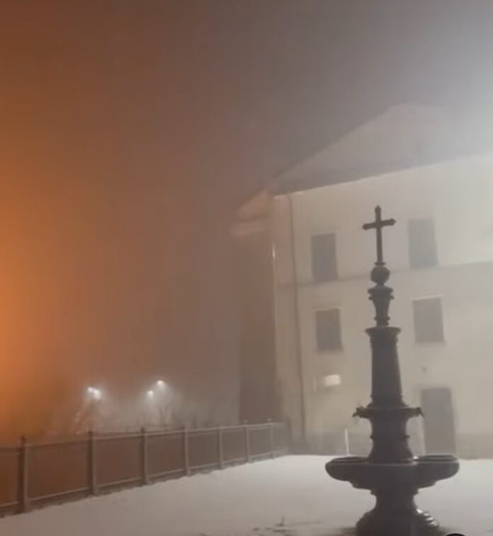 Le immagini della prima neve al Santuario di Montevergine. Il video diffuso dall’Osservatorio Meteorologico mostra nevicate a tratti con intensità moderata. Il fenomeno sta interessando l’area circostante, con un accumulo di circa 1.5 cm di neve al suolo.