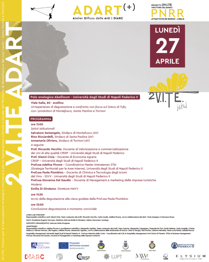 Lunedì 27 aprile, ad Avellino, a partire dalle ore 11, presso il Polo Enologico Abellinum dell’Università degli Studi di Napoli Federico II, si terrà il Living Lab del progetto 2V.I.TE, un’importante occasione di confronto, ricerca e valorizzazione territoriale dedicata al Greco di Tufo e alle produzioni vitivinicole dei comuni di Montefusco, Santa Paolina e Torrioni.