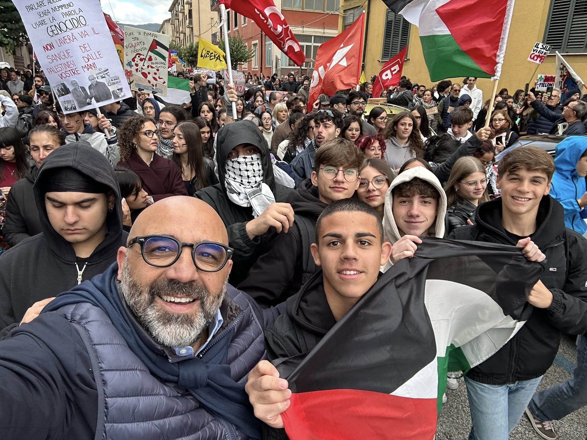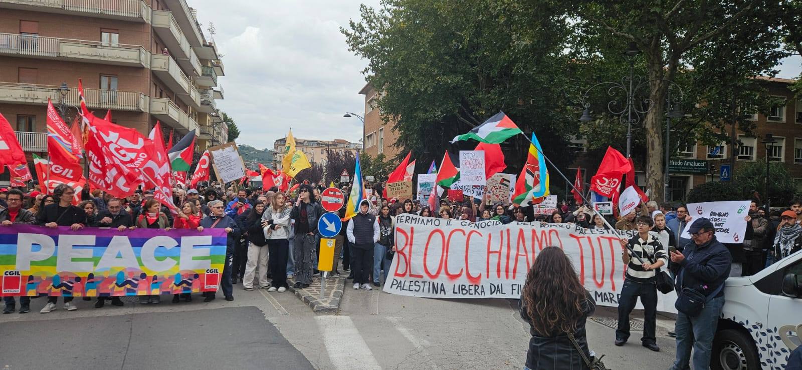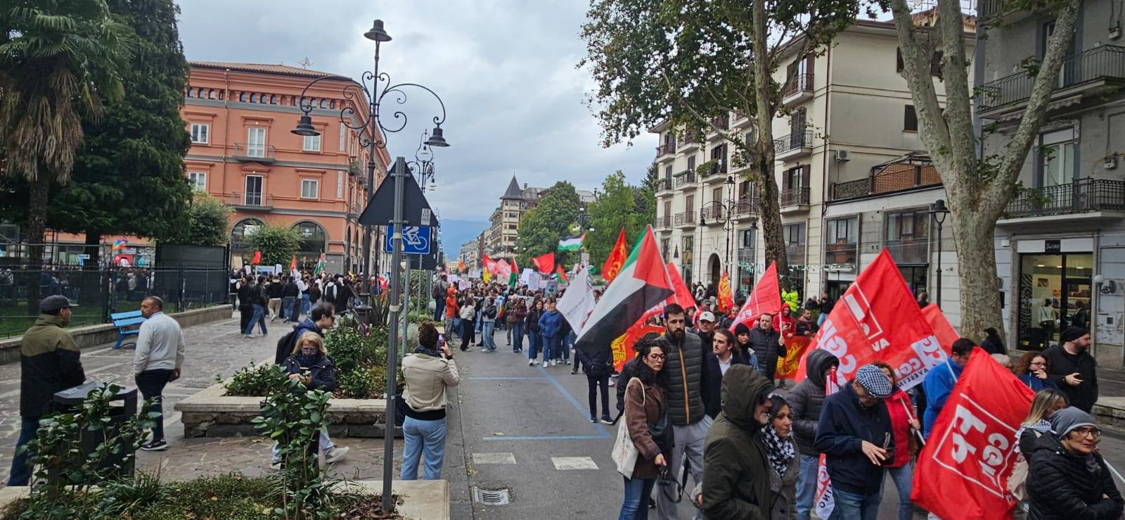 Dal corteo poi una delegazione ha raggiunto Palazzo di Governo per ribadire il sostegno agli attivisti della Global Sumud Flotilla. La manifestazione, che ha sfidato il freddo di questo inizio ottobre, è stata indetta a livello nazionale in concomitanza con lo sciopero generale proclamato dalla Cgil. Ad Avellino, in piazza c’erano la segretaria provinciale del sindacato Italia D’Acierno, esponenti del Pd come il segretario provinciale Nello Pizza e altri dem, rappresentanti di Avs, del Movimento 5 Stelle e dei Giovani Comunisti. Accanto a loro, il Collettivo Studentesco Irpino con Antonio Liuzzi, Libera con Davide Perrotta, Arci con Stefano Iannillo e tante realtà e associazioni del territorio. Al corteo anche don Vitaliano Della Sala, che aveva esposto la bandiera palestinese in chiesa. Ad Ariano, invece, in piazza anche il vescovo Sergio Melillo.