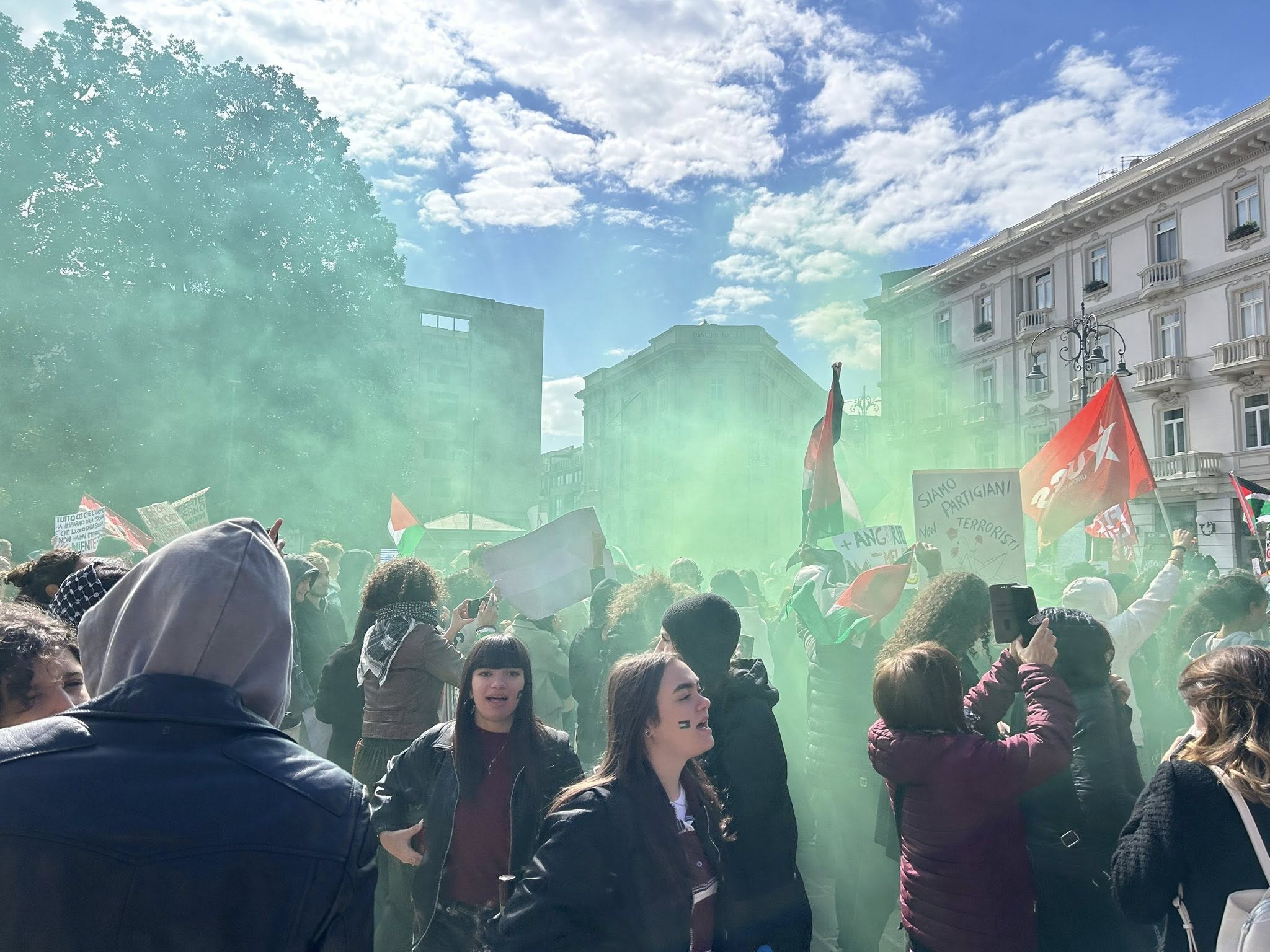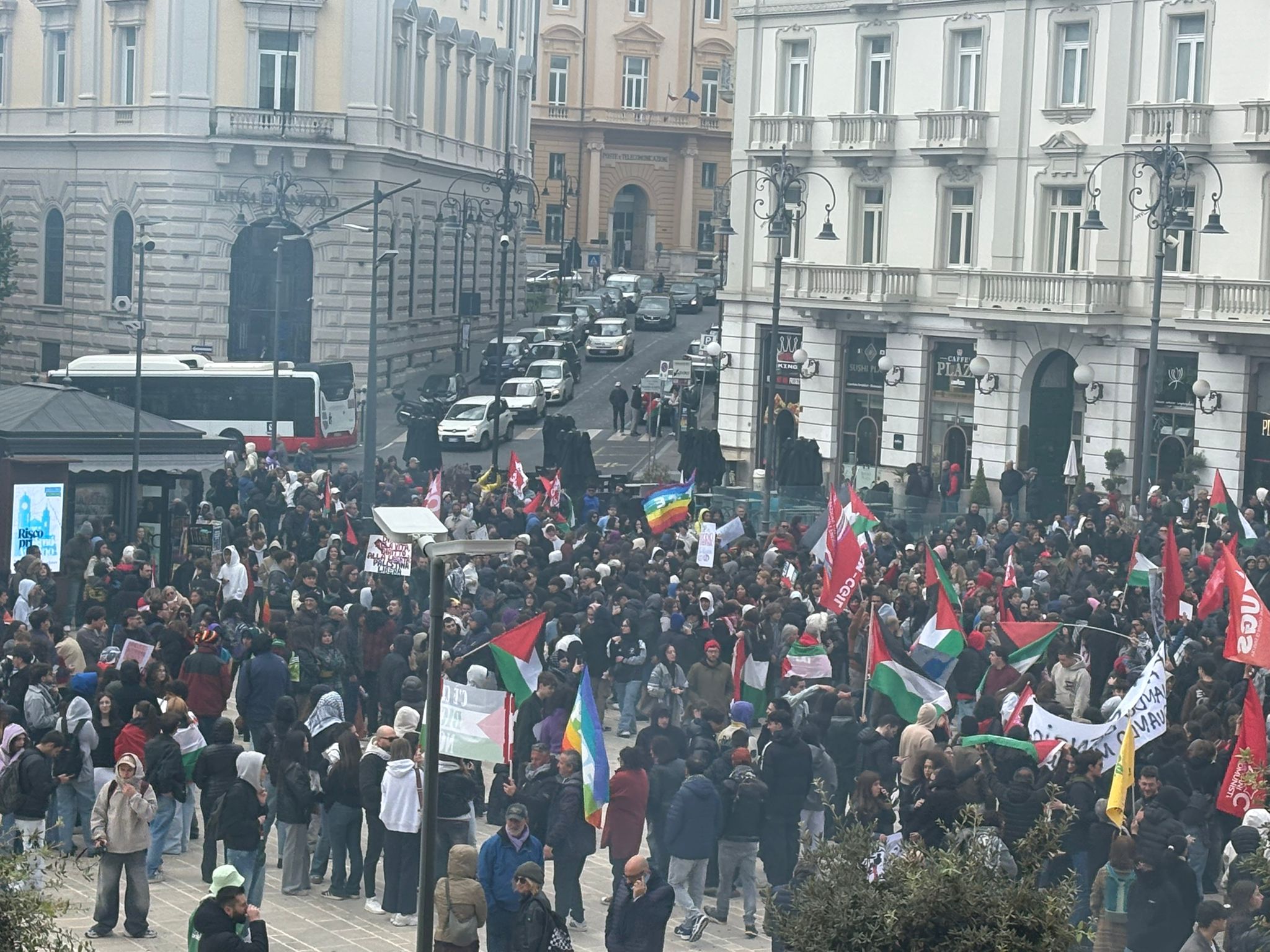 Il colpo d’occhio finale in Piazza Libertà ha mostrato la forza di una mobilitazione che ha unito generazioni e mondi diversi, con un unico messaggio: solidarietà al popolo palestinese e alla flottiglia.