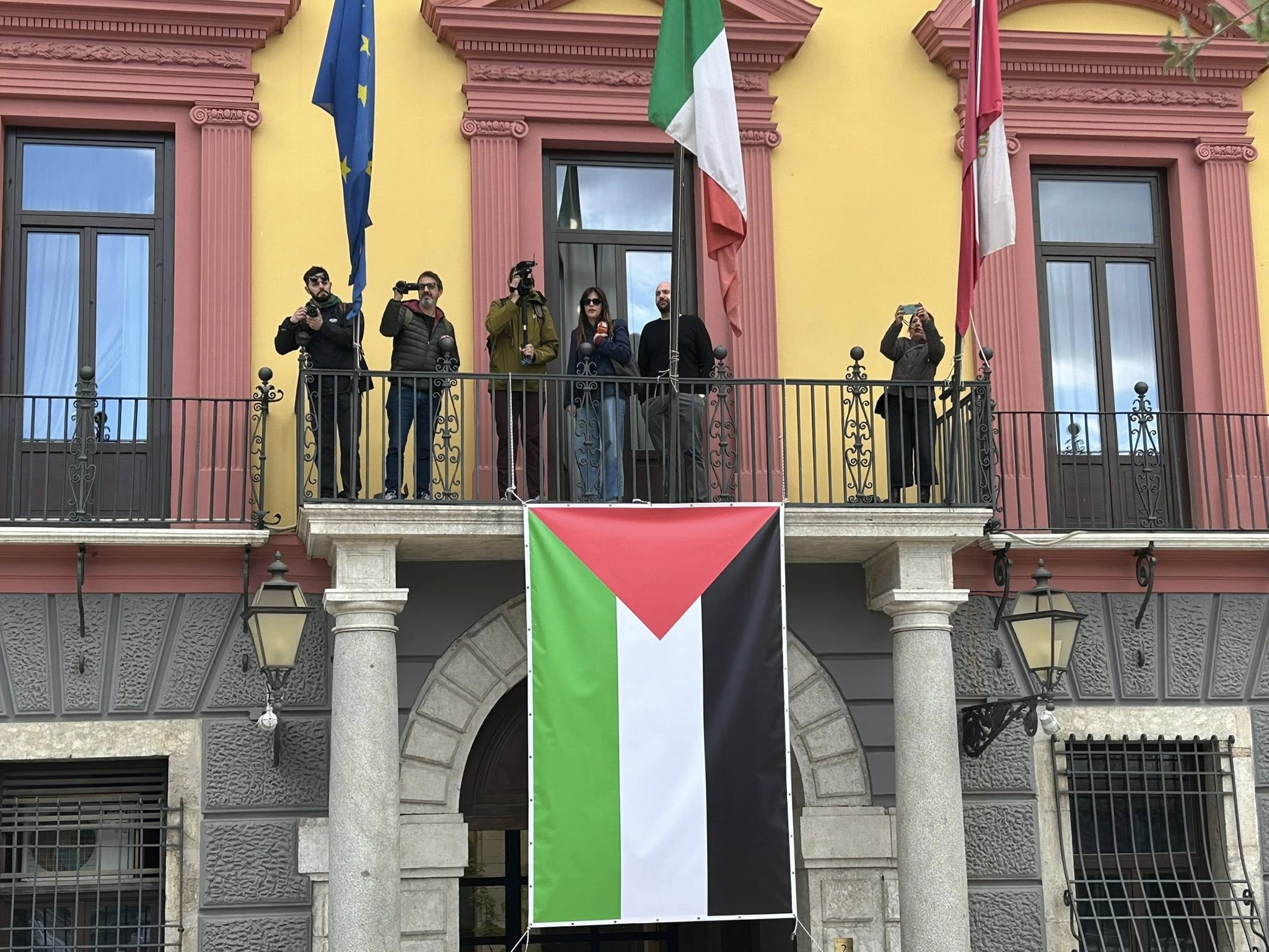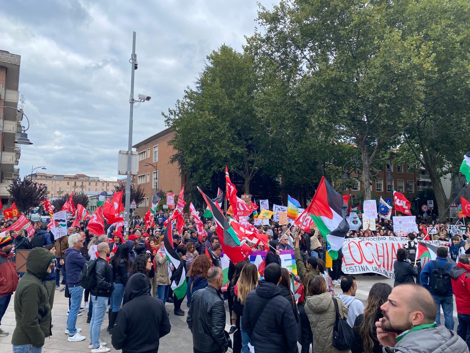 Il lungo serpentone si è mosso da via de Concilis per poi attraversare corso Europa e raggiungere Piazza Libertà, davanti a Palazzo Caracciolo, sede della Provincia. Qui, da ieri, campeggia sulla facciata la bandiera della Palestina, fatta collocare dal presidente Rizieri Buonopane, presente in piazza.