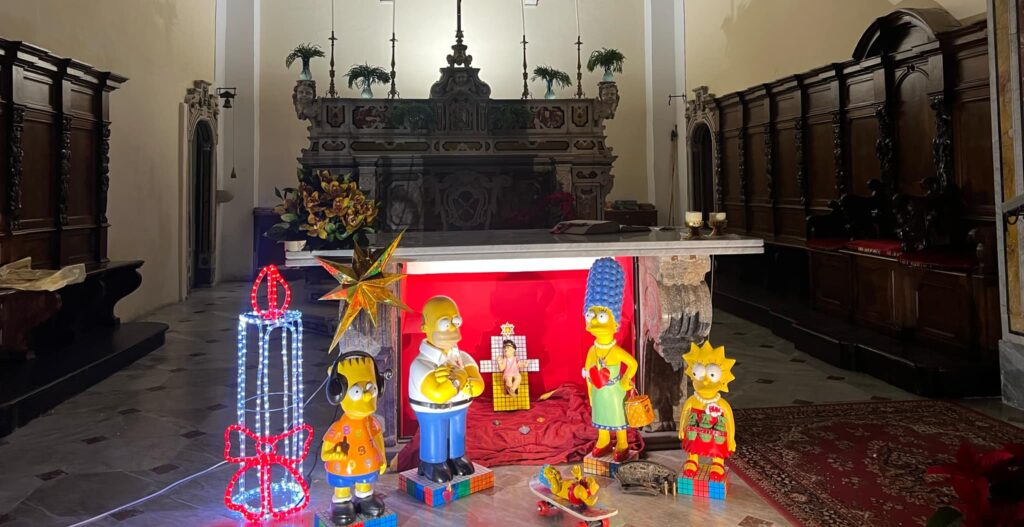 Il presepe di Don Vitaliano è un’opera pop, provocatoria e profondamente simbolica. I protagonisti della scena non sono i soliti pastori o i personaggi biblici, ma i membri della famiglia Simpson, iconico simbolo della cultura popolare contemporanea. Ma la vera provocazione sta nell’immagine centrale: un Gesù che appare sotto le sembianze di Adolf Hitler. Un monito potente e disturbante che invita alla riflessione sulla natura del potere, delle guerre e dei genocidi, richiamando l’urgenza di impegnarsi per il bene comune e per la pace.