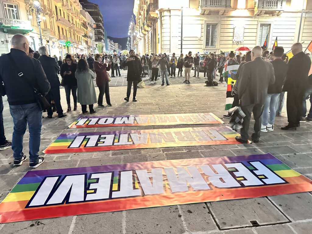 “Fermatevi, fermateli, fermiamoli”. Con questo grido – e con tanto di striscione srotolato a terra – la Rete Italiana Pace e Disarmo ha manifestato in piazza ad Avellino per mantenere alta l’attenzione sul conflitto israelo-palestinese, riesploso con raccapricciante violenza negli ultimi giorni con centinaia di morti, bambini compresi.
