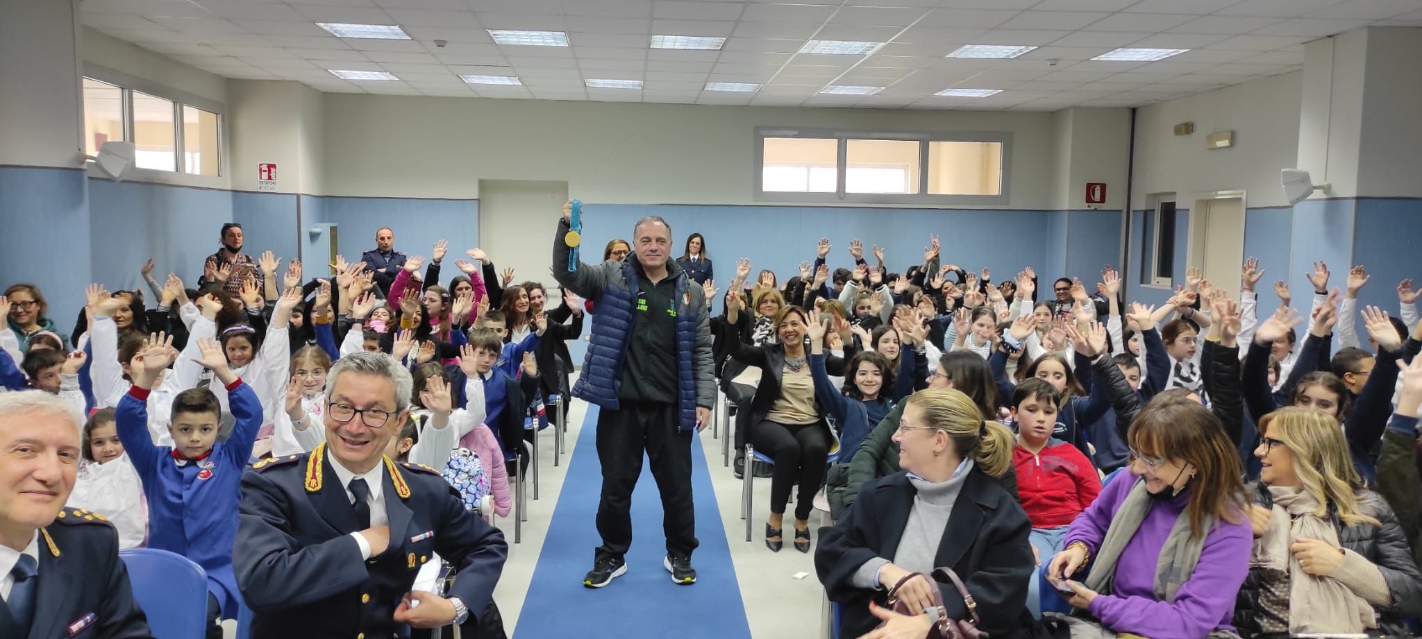 Il campione europeo ha motivato i presenti su come lo sport, attraverso i sacrifici intrapresi, è il giusto veicolo per la conquista di importanti risultati nella vita. Presente in sala anche un altro pugile delle Fiamme Oro, Marzia Davide, responsabile del Centro Sportivo Fiamme Oro “A. Manganelli” che ha illustrato ai presenti le attività delle due discipline sportive, pugilato e lotta libera, che verranno proposte al Centro.