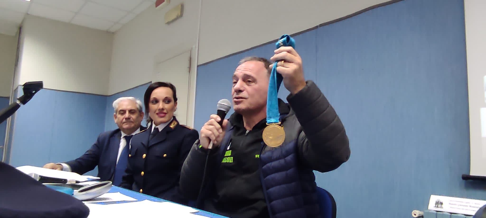 Il momento centrale della manifestazione è stata la testimonianza del Maestro Giovanni Maddaloni, Direttore tecnico della Star Judo di Scampia che, con toccanti parole che hanno emozionato la platea ed entrando nel cuore dei ragazzi, ha convinto sull’importanza dello sport che è fonte di rinascita per un quartiere che si vuole riscattare. Attraverso un’intervista proposta dell’Isp. Velia Giorgione, della locale Divisione Anticrimine, dove sono stati toccati diversi temi quali l’integrazione sociale, la famiglia, il proficuo rapporto tra le istituzioni, ha reso partecipe gli studenti di tutta la sua emozionante vita sportiva costellata da successi sia sportivi che umani nonché dai numerosi titoli italiani e medaglie, compresa quella d’oro olimpica vinta da suo figlio Pino Maddaloni a Sidney nel 2000, che ha mostrato in sala tra i tanti volti dei ragazzi incuriositi e partecipi.