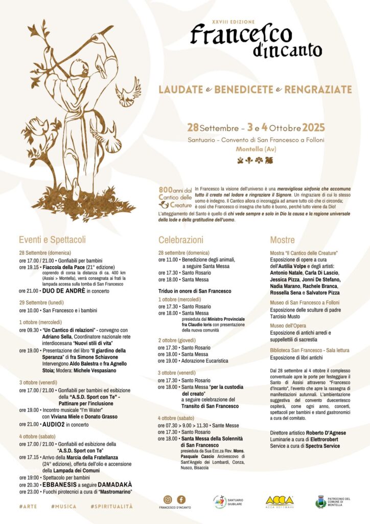 Anche quest’anno, il suggestivo scenario del Santuario di San Francesco a Folloni ospita l’evento “Francesco d’Incanto”, rassegna culturale, artistica e spirituale che unisce fede, tradizione e partecipazione popolare.