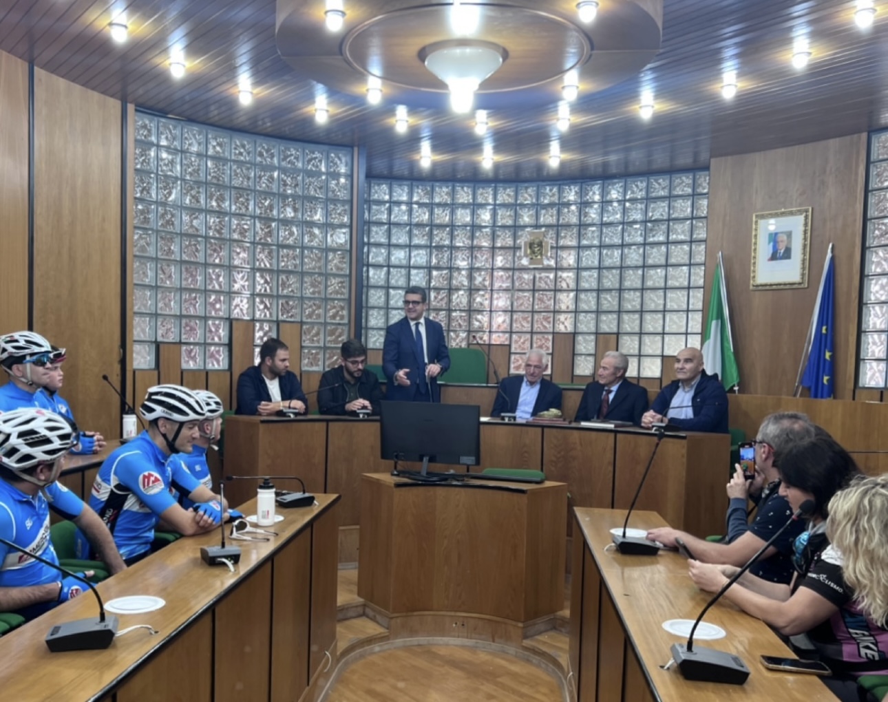 “La visita di Moser, icona dello sport italiano, è un grande onore per la nostra città. Molto bello trovare in un campione del calibro di Moser, nei racconti delle sue gare e dei suoi attuali progetti, tanta umiltà e cordialità. Ringrazio il nostro concittadino Luca Gennarelli che ha invitato in città Moser, suo storico amico, e mi ha coinvolto per la sua accoglienza. Un grazie anche alle associazioni sportive che, nonostante i tempi di organizzazione ristretti, stamattina hanno portato in aula consiliare i loro colori e la passione ciclistica.” – afferma il Sindaco Vittorio D’Alessio.