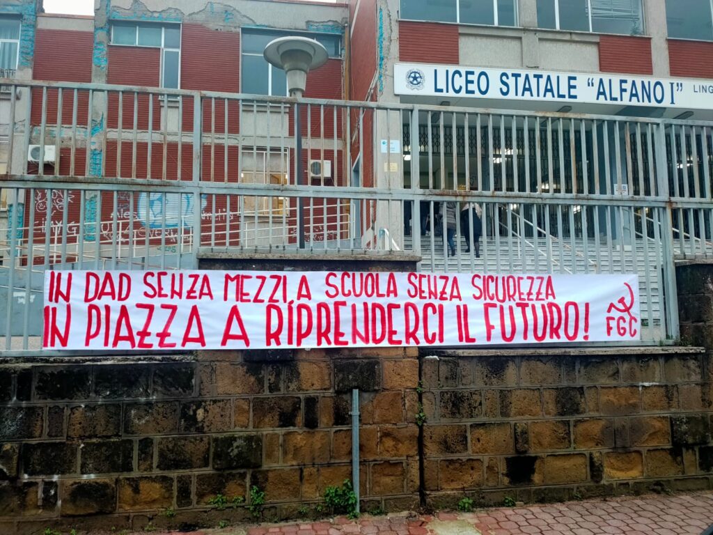 Da Torino a Roma, passando per Salerno, gli studenti si sono mobilitati questa mattina di fronte alle scuole superiori con striscioni e megafoni. Nel giorno in cui si sarebbe dovuti rientrare in presenza il messaggio degli studenti e del Fronte della Gioventù Comunista, organizzazione promotrice delle iniziative, è netto: il clima di incertezza nelle scuole è inaccettabile, a pagarne le conseguenze saranno migliaia di studenti esclusi dal diritto allo studio. I dati IPSOS pubblicati due giorni fa denunciano che almeno uno studente per classe ha abbandonato a causa del COVID. In questo periodo di didattica a distanza l’abbandono scolastico è aumentato in modo vertiginoso. La DAD è stata un fallimento data l’assenza di un supporto reale del Governo alle scuole, la mancanza di dispositivi come tablet e computer e di corsi di sostegno e misure volte a garantire il diritto allo studio. «Rivendichiamo un rientro a scuola con misure di sicurezza che in questo momento sono inesistenti» dichiara Simon Vial, responsabile scuola del FGC «Per le aziende e i settori produttivi si è subito deciso che si sarebbe fatto tutto il possibile per tenerli aperti, nonostante il mese di novembre sia stato quello con il più alto numero di morti dall’inizio della pandemia, mentre le scuole rimangono chiuse senza prospettive per diritto allo studio e per un’apertura sicura.» «Scenderemo in piazza il 29 Gennaio» continua Vial «nella stessa data dello sciopero generale dei lavoratori indetto dal SI-Cobas per conquistare ampie misure per la sicurezza delle scuole. Esprimiamo tutta la nostra contrarietà alle politiche del Governo che gestisce la crisi pandemica per gli interessi delle aziende a scapito di quelli dei lavoratori e, di conseguenza, anche dei figli dei lavoratori, gli studenti. Nelle prossime settimane le proteste studentesche con quelle dei lavoratori continueranno.»