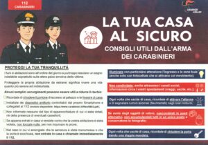 Questo è il messaggio diffuso dal Comando Provinciale Carabinieri di Avellino che garantisce una vigilanza costante, 24 ore su 24, nei Comuni del territorio, massimizzando la presenza di pattuglie in strada. Inoltre, vengono periodicamente svolti controlli straordinari con il supporto di reparti specializzati, come le S.I.O. (Squadre di Intervento Operativo) e le unità cinofile. Oltre alla prevenzione, continuano ininterrottamente anche le attività investigative, spesso lunghe e complesse, che traggono enorme beneficio dal supporto delle vittime con le testimonianze, le informazioni, le foto e i video da loro forniti, sia dalle telecamere pubbliche che private. Nonostante l’incessante impegno delle Forze dell’Ordine, il fatto che i responsabili non vengano sempre assicurati alla giustizia nell’immediato genera un persistente senso di insicurezza. Per questo motivo, è fondamentale il coinvolgimento attivo dei cittadini. A tale scopo, sono stati realizzati due opuscoli informativi che suggeriscono i piccoli accorgimenti quotidiani utili da mettere in pratica da un lato per proteggere meglio le proprie abitazioni senza stravolgere le proprie abitudini, dall’altro scoraggiare chiunque nel perpetrale tali azioni criminali. Questi consigli nascono da uno studio nazionale, appositamente attagliato ai casi specifici avvenuti sul territorio irpino dal settembre dello scorso anno sino ad oggi.
