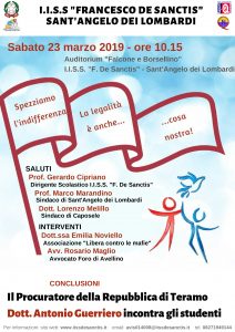Anche quest’anno l’IISS De Sanctis guidato dal Dirigente Scolastico Prof. Gerardo Cipriano si appresta a celebrare il prossimo 23 marzo la Giornata della Legalità. Il programma prevede dopo i saluti Istituzionali del Dirigente Scolastico, la partecipazione dei Sindaci dei Comuni di Sant’Angelo dei Lombardi e di Caposele , della Dott.ssa Emilia Noviello Responsabile Regionale dell’Associazione “Libera contro tutte le mafie” , dell’ Avvocato Rosario Maglio del Foro di Avellino e si concluderà con la Lectio Magistralis del Procuratore della Repubblica di Teramo Dott. Antonio Guerriero che, a distanza di sei anni, ritornerà in Irpinia per parlare alle giovani generazioni di studenti della «Cultura della legalità», nella piena consapevolezza che il termine Legalità non significa parlare solo di lotta alla Mafia, ma di una rinnovata alleanza tra istituzioni ( in primis la Scuola) e società civile unite nella costruzione del bene comune.