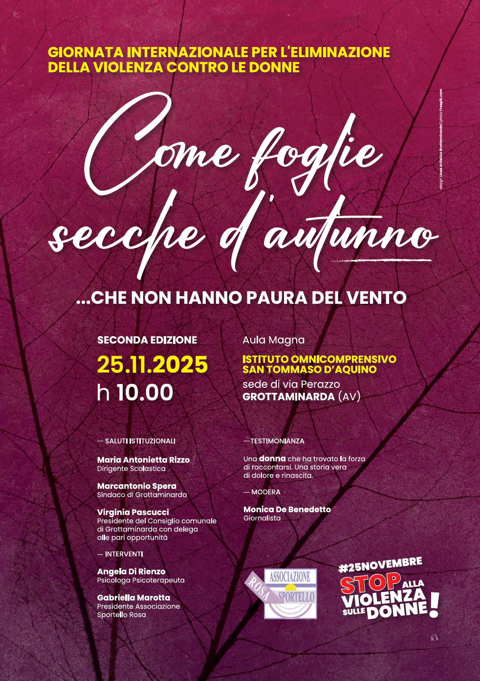 Domani, martedì 25 novembre, in occasione della Giornata Internazionale per l’eliminazione della violenza sulle donne, seconda edizione di “Come foglie secche d’Autunno… che non hanno paura del vento”, incontro a cura dell’Istituto Omnicomprensivo San Tommaso d’Aquino con la collaborazione del Comune di Grottaminarda e dell’Associazione Sportello Rosa.