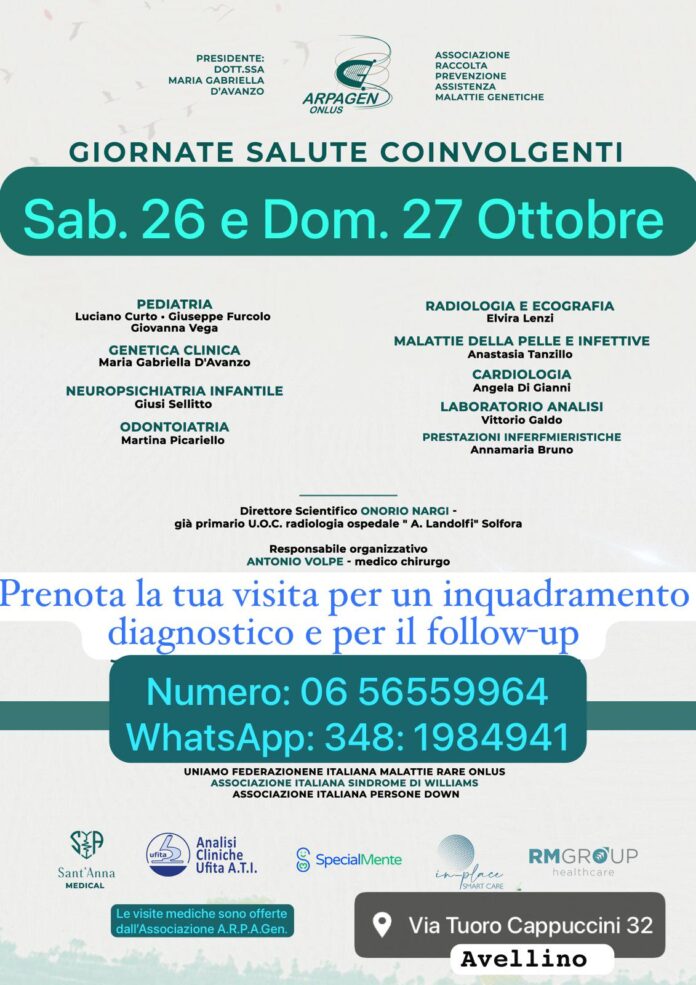 Il 26 e 27 ottobre si terranno le Giornate Salute Coinvolgenti, volute ed organizzate dall’Associazione ARPAGen presidente Maria Gabriella D’Avanzo Sellitto. È un’importante iniziativa dedicata all’ inquadramento e follow-up delle malattie rare. L’evento, che si svolgerà negli ambulatori del Grande Pediatra Fulvio Sellitto in via Tuoro Cappuccini 32 Avellino vedrà la partecipazione di esperti in vari ambiti medici, offrendo visite specialistiche e consulenze per cercare e trovare la diagnosi di malattie rare.