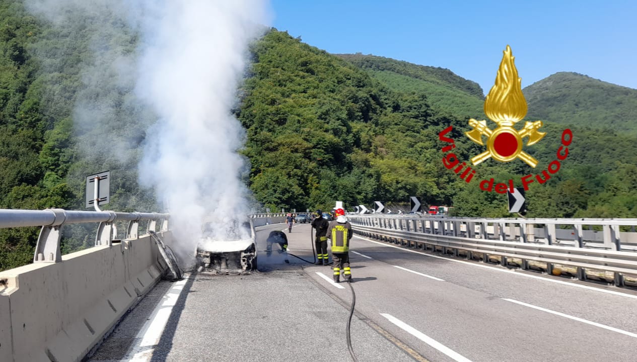Le fiamme che hanno avvolto l’autovettura in transito, sono state spente dai caschi rossi che hanno poi messo in sicurezza l’area.