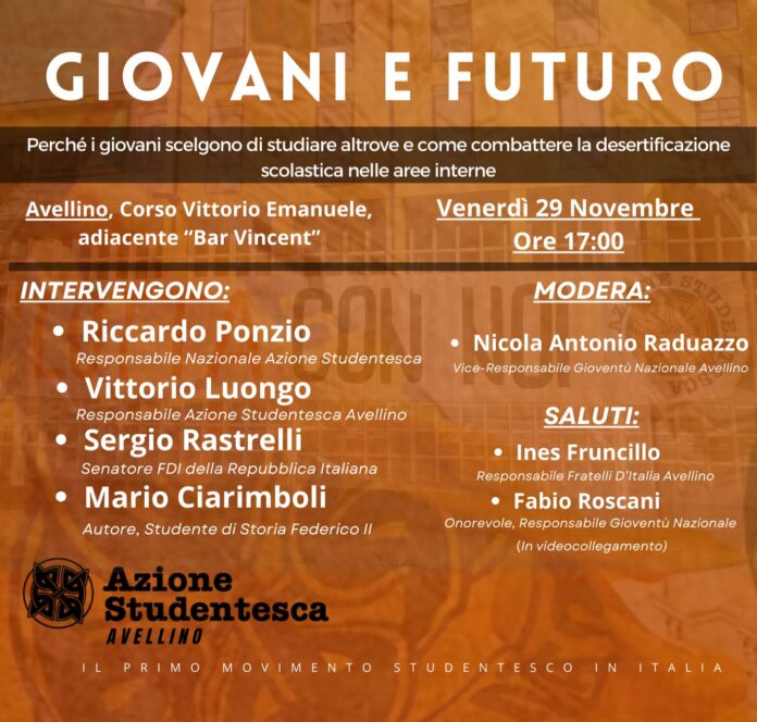 Venerdì 29 novembre, alle ore 17:00, presso la sede provinciale di Fratelli d’Italia Avellino si terrà un incontro promosso da Vittorio Luongo, Responsabile di Azione Studentesca Avellino; ovvero il ramo di Gioventù Nazionale attivo all’interno della scuole superiori.