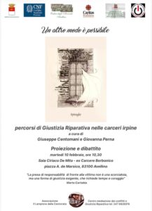 Nel corso dell’iniziativa, sarà presentato un documentario dedicato a esperienze maturate in ambito carcerario e territoriale. I saluti istituzionali saranno affidati al presidente della Provincia di Avellino, Rizieri Buonopane mentre il video sarà introdotto da Pietro Centomani, responsabile del montaggio, e da Giuseppe Centomani, coordinatore tecnico del Centro di Giustizia Riparativa e di aiuto alle vittime di reato.