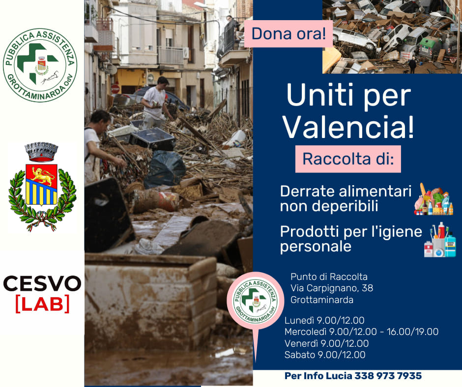 E così la Pubblica Assistenza di Grottaminarda ed il Comune di Grottaminarda, accogliendo l’appello lanciato nei giorni scorsi dal CSV Irpinia Sannio ETS, “Uniti per Valencia”, si sono attivati per la raccolta di derrate alimentari e prodotti per l’igiene personale da inviare in Spagna.
